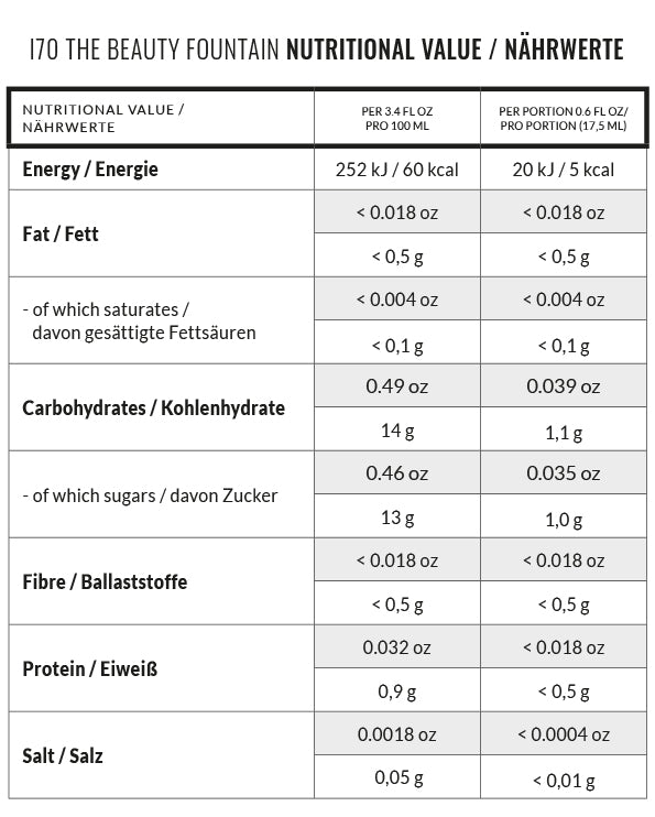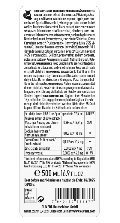 Extracto acuoso de extracto de oliva (olea europaea), concentrado de zumo de manzana, concentrado de zumo de uva blanca, concentrado de zumo de grosella negra, concentrado de zumo de saúco, hialuronato de sodio, hidroxitirosol, citrato de zinc, extracto de fruto de Camu Camu 4:1 (myrciaria dubia, 25% vitamina C), extracto de flor de lavanda 10:1 (lavandula pedunculata), extracto de curcumina (45% curcuminoides), D-Biotina. Conservante: benzoato de sodio, sorbato de potasio.