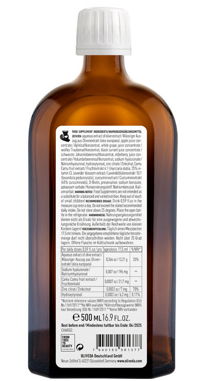 Esta potente mezcla vegana de ácido hialurónico e hidroxitirosol está fortificada con lavanda , grosella negra, cúrcuma, camu camu y saúco negro. Cada dosis diaria ( 0,59 onzas líquidas) proporciona 6,3 mg de hidroxitirosol para una protección celular óptima (según investigación de la EFSA) y 200 mg de ácido hialurónico para una hidratación profunda y un efecto voluminizador. Experimenta una piel más tonificada y radiante: el efecto voluminizador característico de OLIVEDA Beauty.