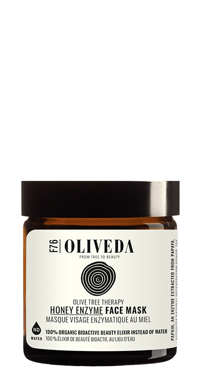 This enzymatic peeling mask frees the skin from dead skin cells, refines the pores and leaves the complexion radiant and even. Honey moisturizes the skin and has a soothing benefit. Papain, an enzyme derived from papaya, activates the natural rejuvenating power, the topmost skin cells are sloughed away and the skin is revitalized. The luxurious Arbequina oil provides a velvety, soft skin feeling. As part of the waterless beauty movement, this revolutionary formula replaces 70% of water with a potent elixir from olive leaves. It’s a powerful, concentrated solution that delivers intense nourishment and hydration—From Tree to Beauty.