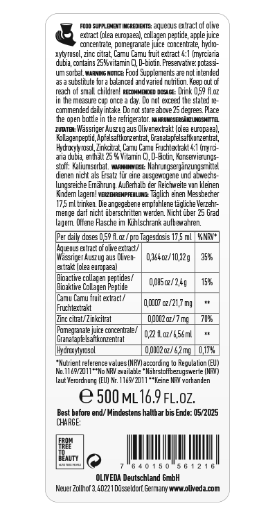 aqueous extract of olive extract (olea europaea), collagen peptide, apple juice concentrate, pomegranate juice concentrate, hydroxytyrosol, zinc citrat, Camu Camu fruit extract 4:1 (myrciaria dubia, contains 25% vitamin C), D-biotin. Preservative: potassium sorbate.