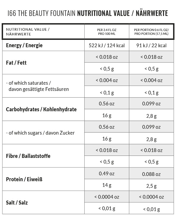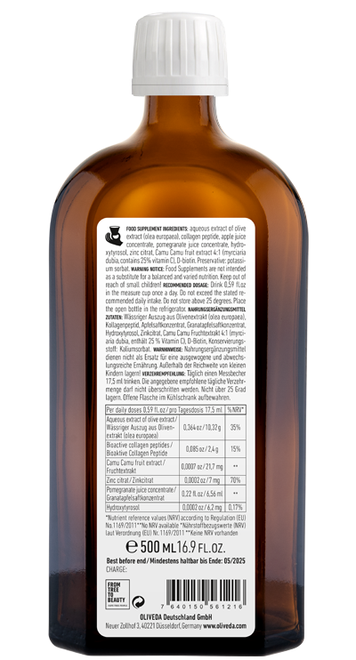 aqueous extract of olive extract (olea europaea), collagen peptide, apple juice concentrate, pomegranate juice concentrate, hydroxytyrosol, zinc citrat, Camu Camu fruit extract 4:1 (myrciaria dubia, contains 25% vitamin C), D-biotin. Preservative: potassium sorbate.